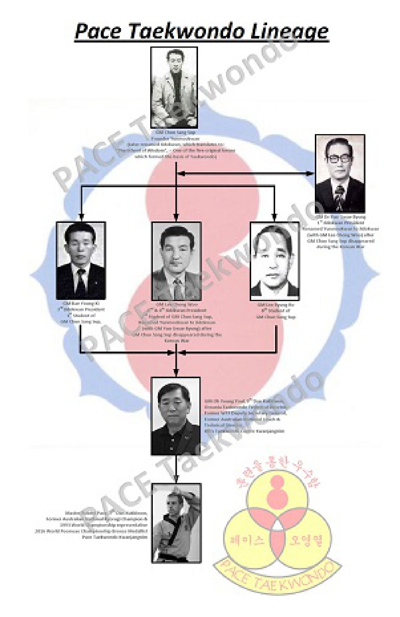 Pace Taekwondo can define its lineage directly to the foundation Kwans of Taekwondo. Master Robert Pace is one of the senior students of Grandmaster Young Youl Oh. GM Oh started his training in the 1950s at the Hanguk Cheyukkwan (Korea Gymnasium) in Seoul. This was the headquarters of the Jidokwan. His instructors were GMs Lee Chong Woo, Bae Young Ki and Lee Byung Ro. GM Bae Young Ki was the 1st student of the Jidokwan Founder GM Chun Sang Sup. GM Lee Chong Woo was the 2nd student of GM Chun. GM Chun was killed during the Korean War. The Jidokwan name was coined by GM Lee Chong Woo and GM Yun Kwei Byung and means "The School Of Wisdom".
